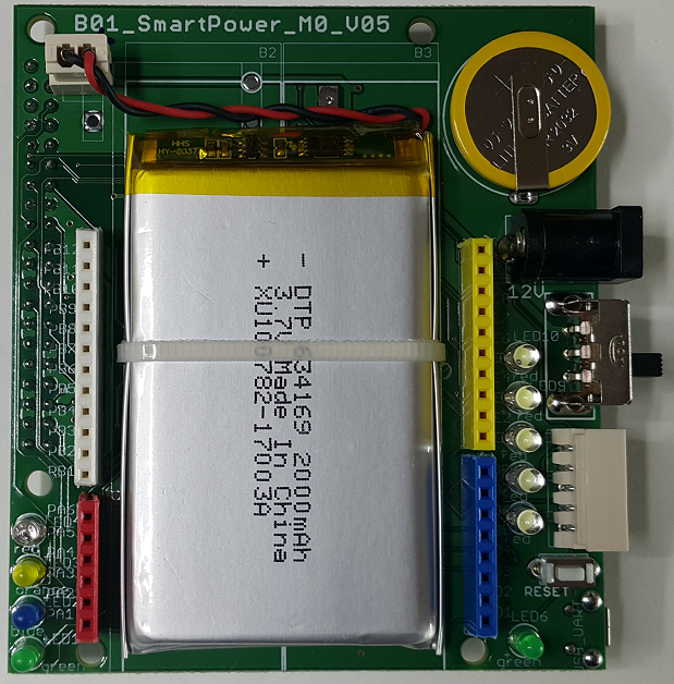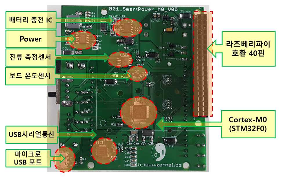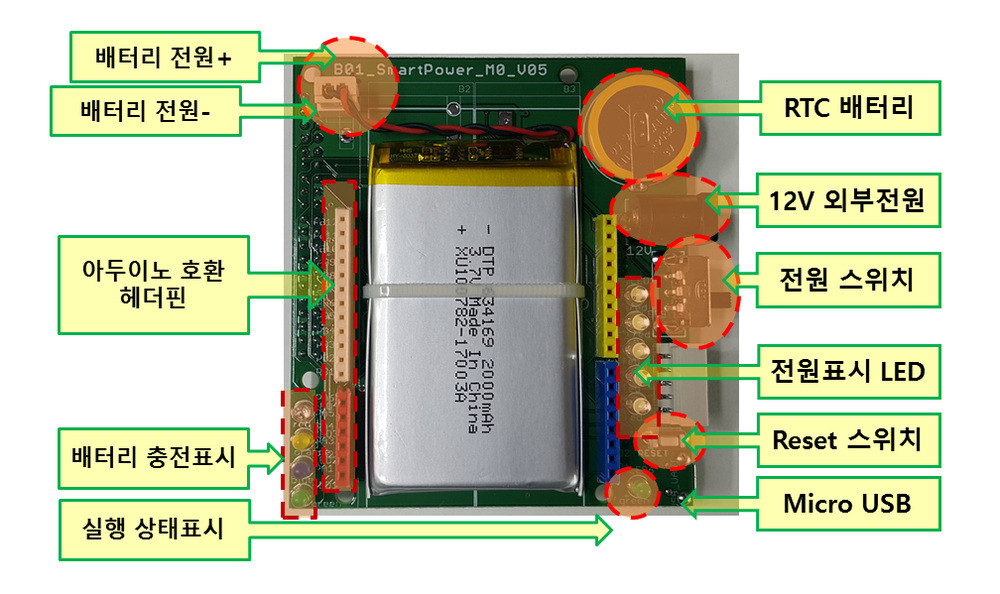 12V 외부 전원과 배터리를 모두 사용할 수 있고, 여기에 적층 형태로 장착되는 라즈베리파이, 아두이노, 무선통신모듈, 센서, 모터, 카메라, 사운드 모듈등에 전원을 공급하고 On/Off 스위칭합니다. Cortex-M0(STM32F0) MCU가 탑재되어 있어서 배터리 충전상태, 전류 사용량, 전원 On/Off 스위칭 제어, 보드 표면 온도, RTC 날짜 및 시간등을 시리얼통신 명령어로 모니터링하고 관리할 수 있습니다.