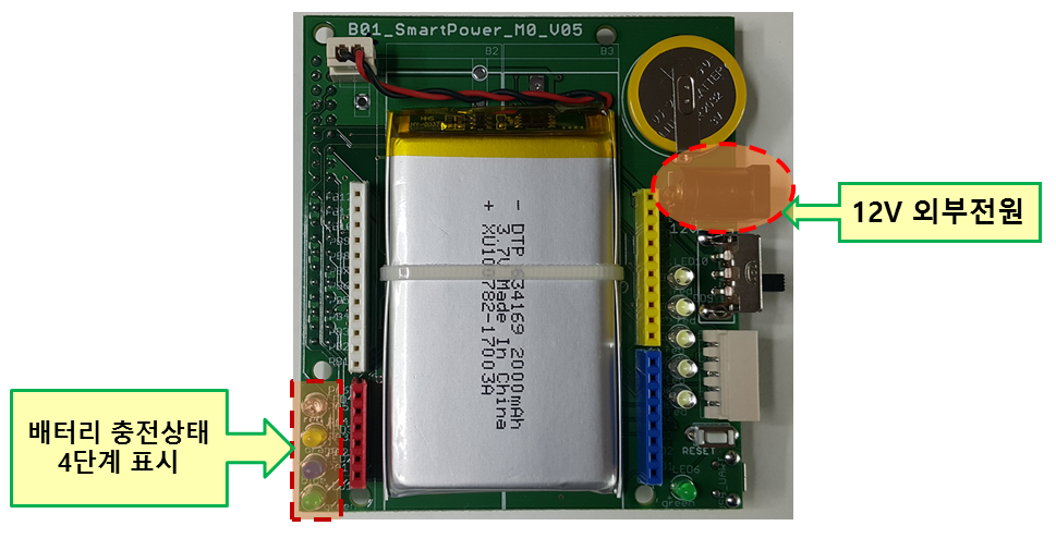 배터리 충전은 아래 그림과 같이 12V 외부 어댑터 전원을 인가하면 전원 스위치에 상관없이 바로 충전을 시작합니다.
