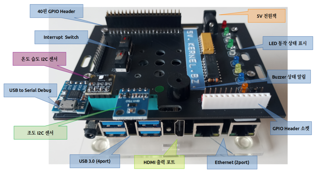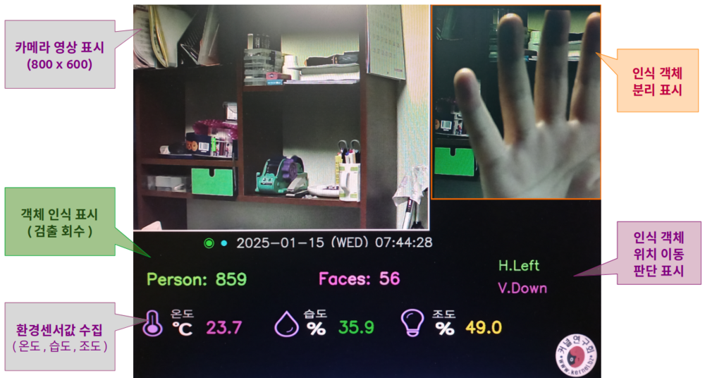 화면(Screen) 출력은 C언어 표준 라이브러를 사용하여 비디오 메모리(FrameBuffer)에 직접 출력하여 실행 속도를 개선 했습니다. 아울러 객체를 인식한 회수와 객체의 위치 이동을 판단하여 표시 합니다. 또한 동시에 환경센서(온도, 습도, 조도) 데이터를 수집하여 출력 합니다. 이러한 기능은 커널연구회에서 SDK를 제작하여 현장 프로젝트에 맞춤형으로 제공하는 기능들 입니다.